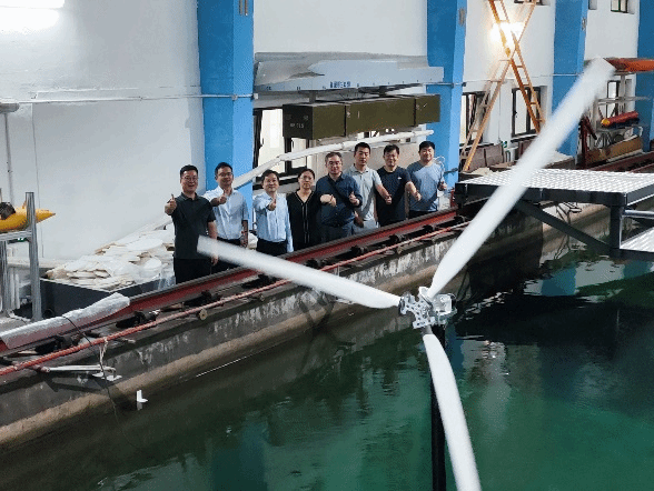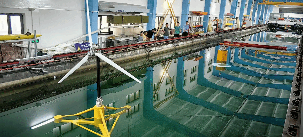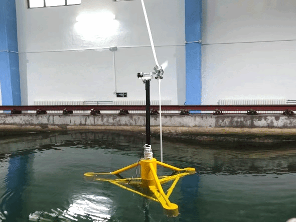 现场演示部分在大连理工大学船模拖曳水池进行,以实测的装置发电功率密度作为评分依据。参赛选手们将他们自主设计制作的可再生能源装置投放水中,进行组装和系泊,并连接发电功率监测装置,实时测试该装置在风浪共同作用下的运动响应和发电效率。同评委专家们根据参赛装置的现场表现给出改进建议,与参赛队员共同探讨与交流,帮助队员对相关风力发电和波浪发电装置进行深入探索。