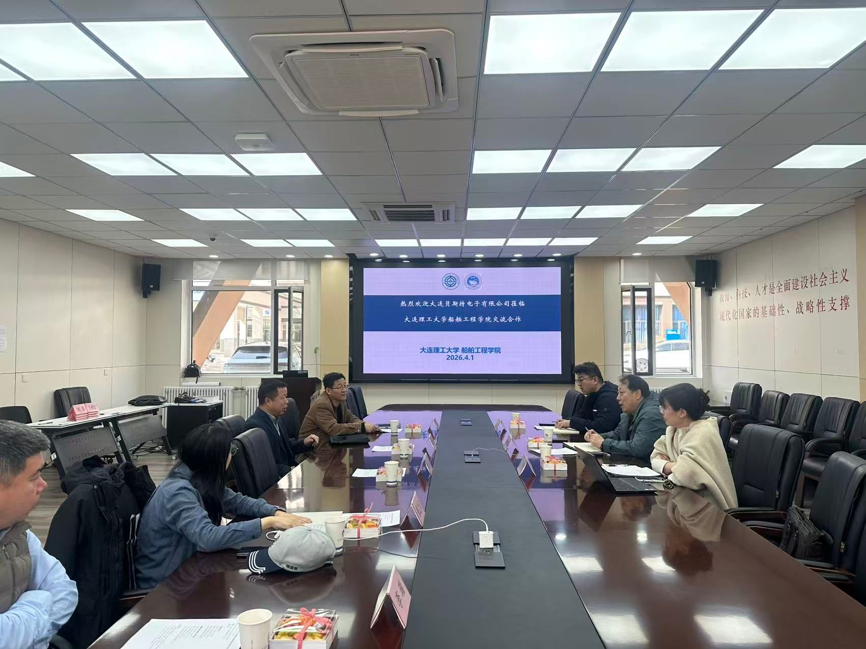 2026年4月1日下午,大连贝斯特电子有限公司(以下简称“贝斯特”)董事长孙文强一行莅临大连理工大学船舶工程学院,就深化校企合作、推动技术协同创新等议题开展交流座谈。船舶工程学院院长张桂勇、副院长王运龙、院长助理张之凡及船舶与海洋工程制造工艺研究所副所长李瑞等出席会议。双方聚焦共建市级重点实验室、智能海洋装备人才培养、海上试验合作等核心议题,共谋校企协同创新新篇章。