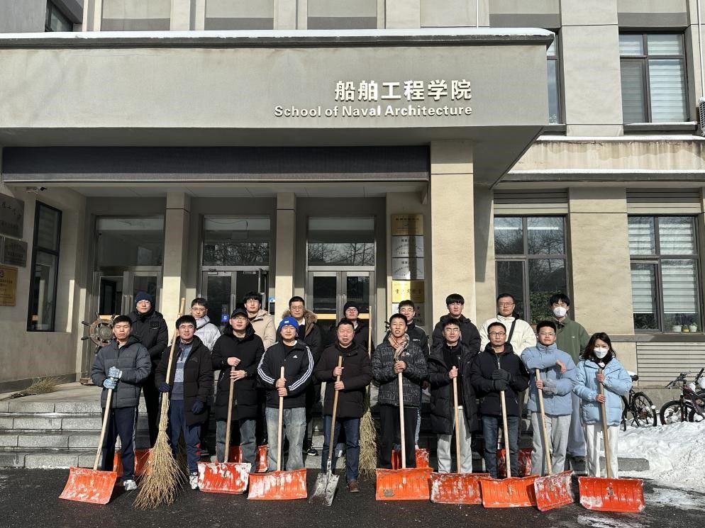为了充分保障师生在校园内的出行安全,消除雪天路滑的安全隐患,12月17日上午11时,船舶工程学院院长、船舶教工第一党支部书记张桂勇带领船舶流体博士生党支部、船舶水动力硕士生第一党支部和船舶水动力硕士生第二党支部的同志们,再次开展了道路积雪清扫活动。同志们不怕辛苦,不畏寒冷,在老师们的带领下干劲十足,有的同志用推雪铲将路面上的积雪推到路边,有的同志用铁锹将冻结在地面上的雪块铲除,有的同志用扫帚将路面残余的碎雪清扫,大家分工明确,团结协作。