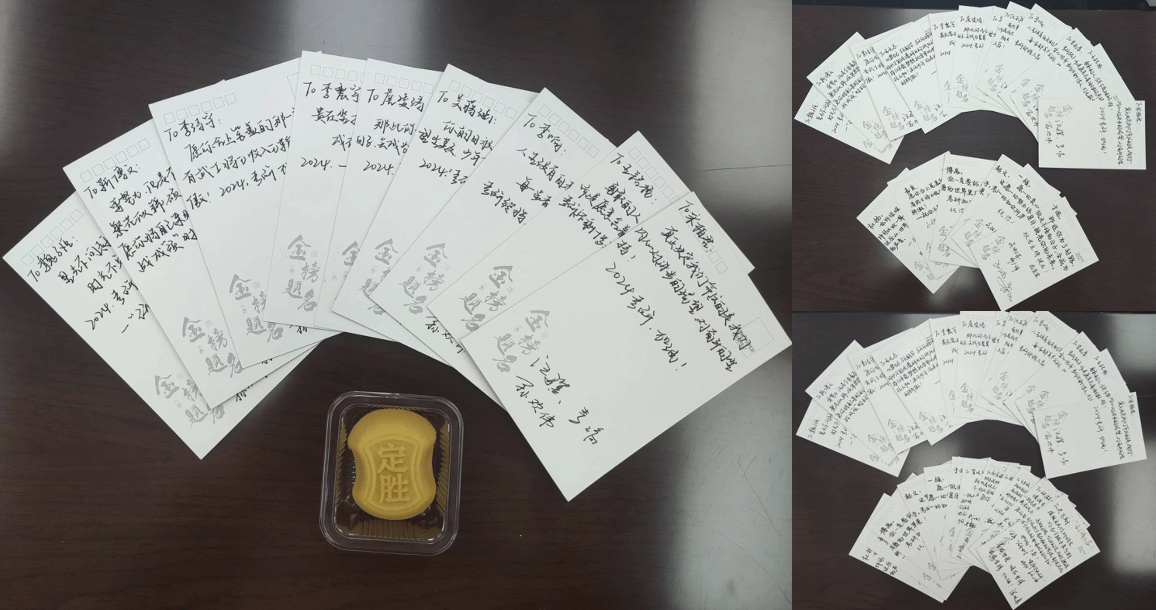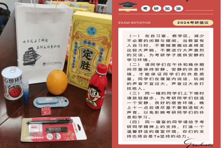 送温暖,用心用情送上考前祝福。学院积极营造良好的复习备考环境,倡议同学们在自习室、教学区和午休、晚休时间保持安静。特别邀请班主任老师、考生家长及学生干部,为考生们书写祝福卡片,鼓励考研学生放平心态,劳逸结合。围绕“考研定胜,一战成硕”的主题,学院精心准备了考研大礼包,为学子们购置了象征“凡事笃定,旗开得胜”的定胜糕、寓意“心想事橙”的蜂蜜橙、象征希望和茁壮生长的植物盲盒,礼包还包含徽章、旺仔牛奶、文具套装、巧克力等。一袋袋精心准备的大礼包、一张张写满祝福的明信片,都饱含了学院对考研学子们浓浓的关爱和殷切的期盼,希望考研学子平安如意,一“研”为定、成功上岸!