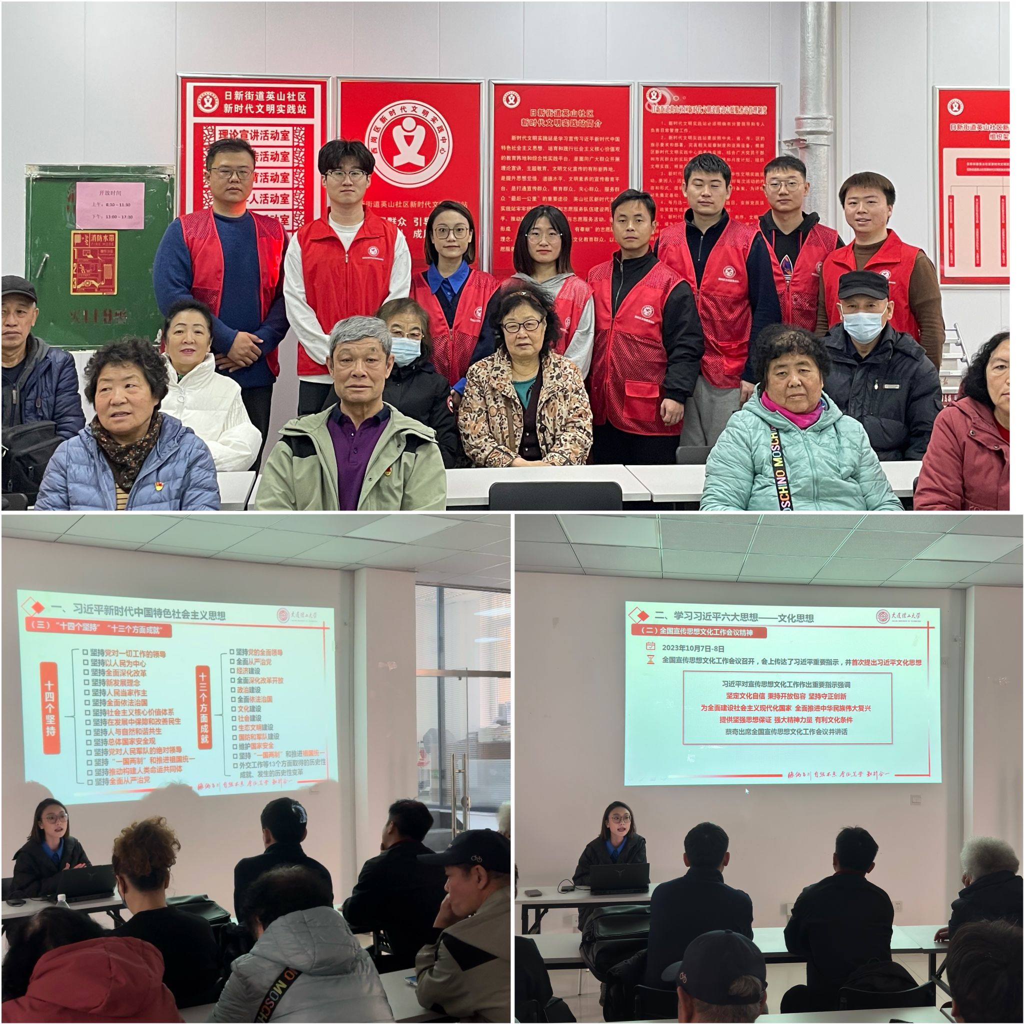 在大连市西岗区日新街道英山社区服务中心,王亚澜老师面向社区老党员同志进行了《深入学习贯彻习近平新时代中国特色社会主义思想》党课宣讲,围绕党的二十大报告、习近平总书记在新时代推动东北全面振兴座谈会上的重要讲话等内容对中国式现代化等内容进行阐述。各支部学生党员还参与了社区的志愿服务工作,与社区老党员同志们进行深入交流。
