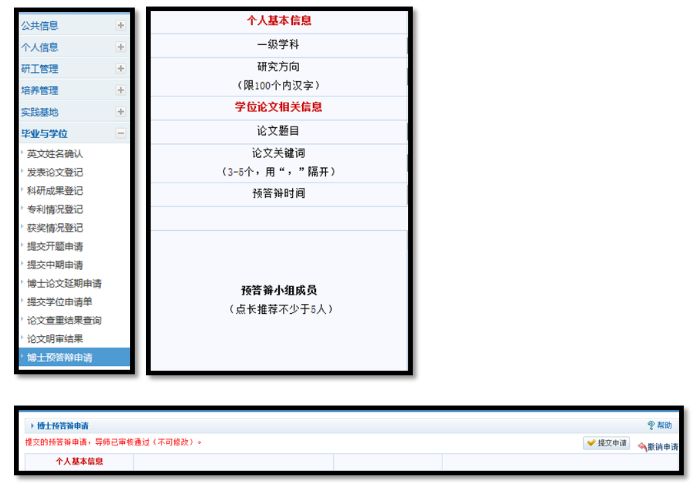 6、预答辩后在研究生管理系统里提交预答辩申请,填写并提交申请后,由导师审核。