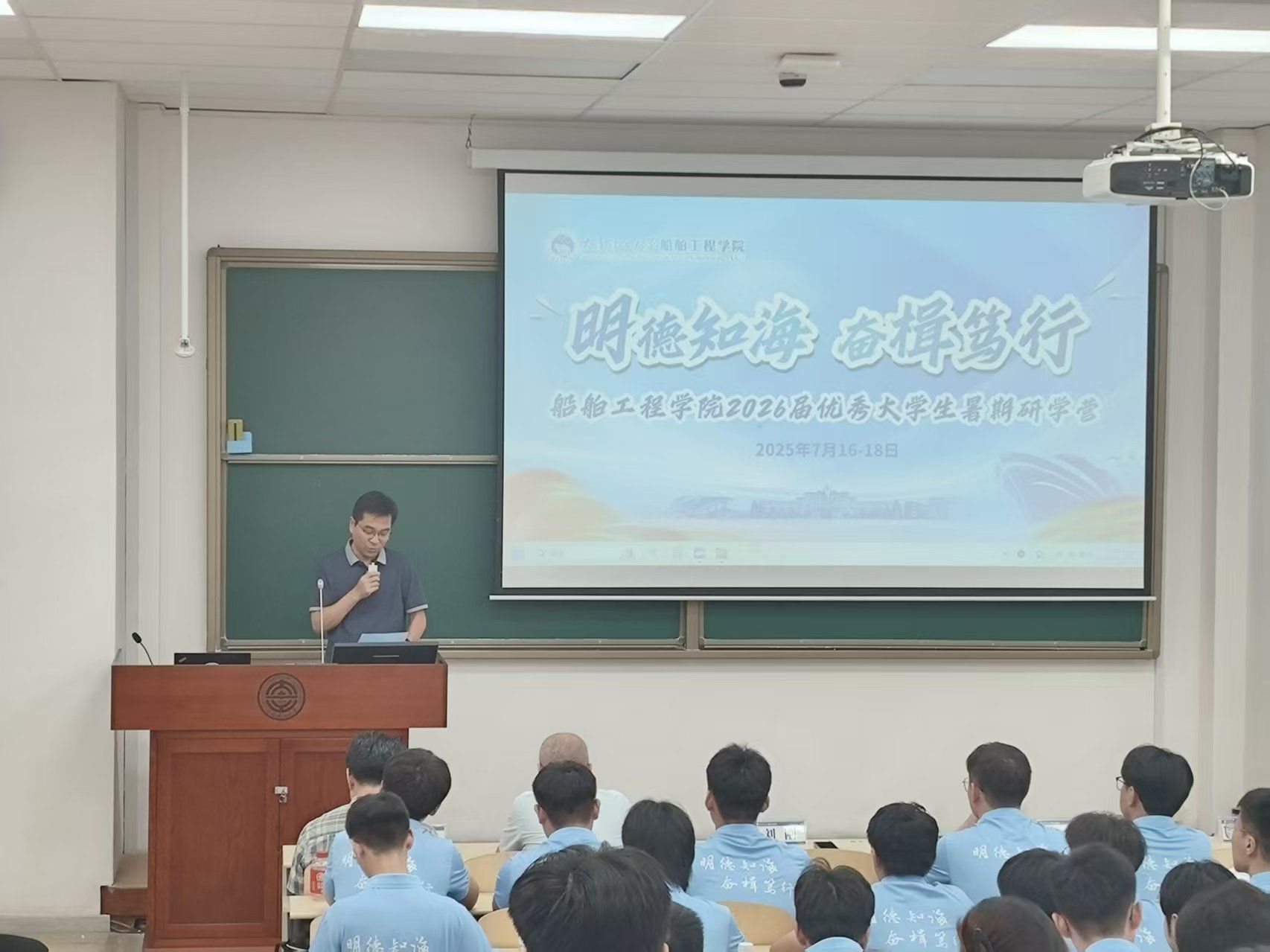 7月16日下午,船舶工程学院在建筑艺术馆114举行2026届优秀大学生暑期研学营开营仪式。出席开营仪式的有船舶工程学院党委书记刘刚教授、学院副院长汪骥教授及各研究所所长、副所长。开营仪式由汪骥主持。