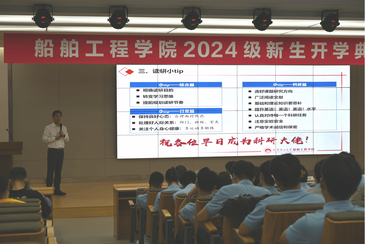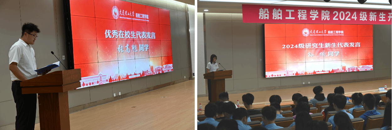典礼伊始,全体起立,奏唱《中华人民共和国国歌》,庄严的旋律回荡在报告厅内,为本次活动拉开了序幕。在校研究生代表张高魁同学发言,分享了在大连理工大学求学的收获与感悟,谈及了在新时代船舶与海洋工程领域中,扎实知识积累和勇于追梦的重要性。接着,2024级研究生新生代表孙楠同学发言,总结了本科期间在学院获得的支持与帮助,表达了对未来研究生生活的期许,与全体新生共勉。