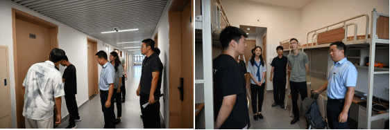 学院院长张桂勇教授与学院党委副书记、副院长孙波老师深入迎新现场,实地走访新生宿舍,仔细查看宿舍的朝向采光、卫浴配置与安全设施。辅导员与志愿者们积极引导、热情关怀,让新生在新“家”安心开启研究生生活。