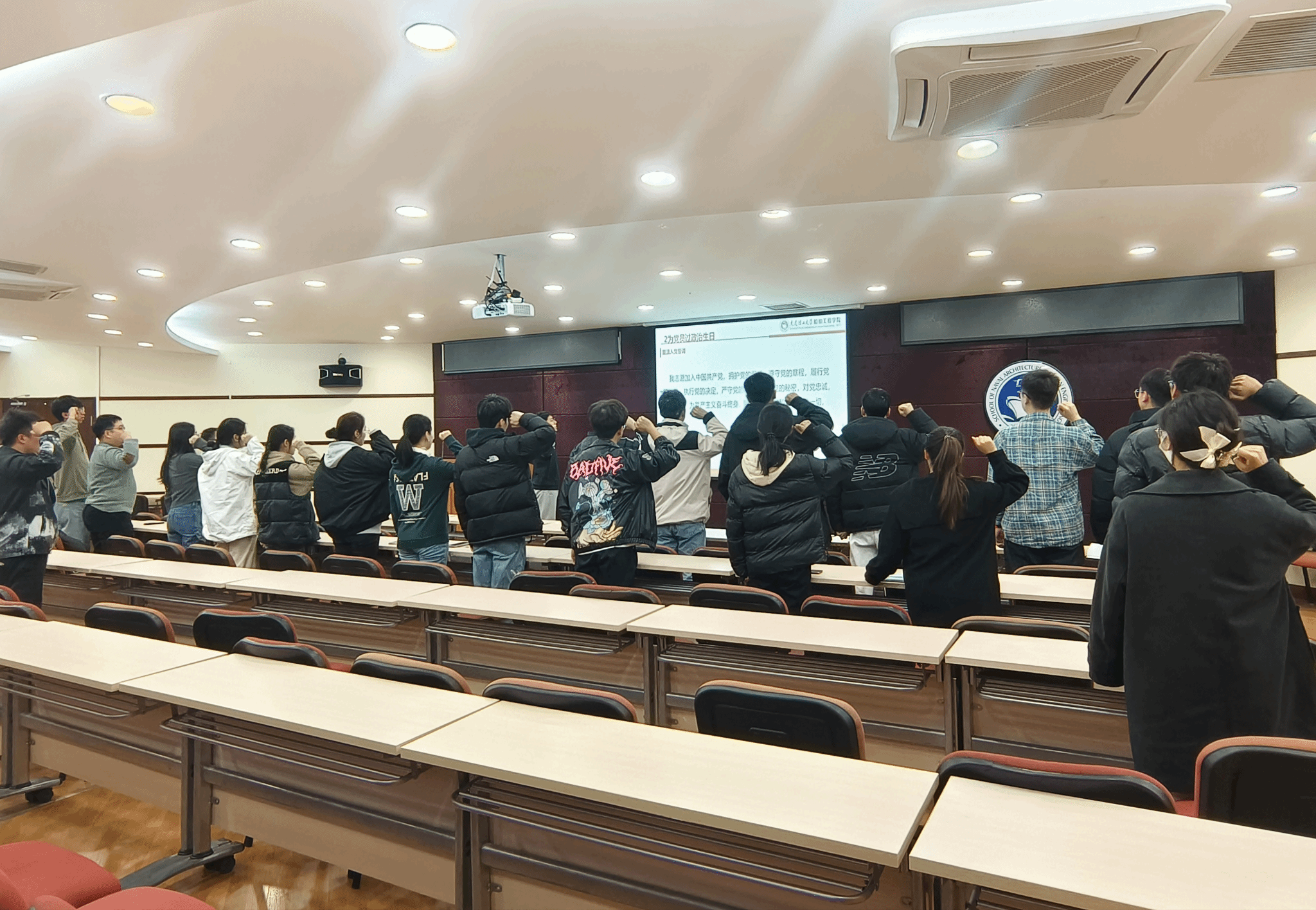 会议第二个环节,为引导党员时刻不忘自己的“第一身份”,增强党员的组织和纪律观念,增强党员的使命感,进而促进支部全体学生党员发挥先锋模范作用,增进党支部内同志之间的相互了解,在张云开的主持下,为于鹏法、唐倩同志过“政治生日”,之后由王轩、李桢同志为两位同志佩戴党徽,最后全体党支部成员进行了重温入党誓词仪式。党支部成员纷纷表示在之后的学习生活中会不断擦亮初心,不忘责任和使命,争做一名合格且优秀的党员!