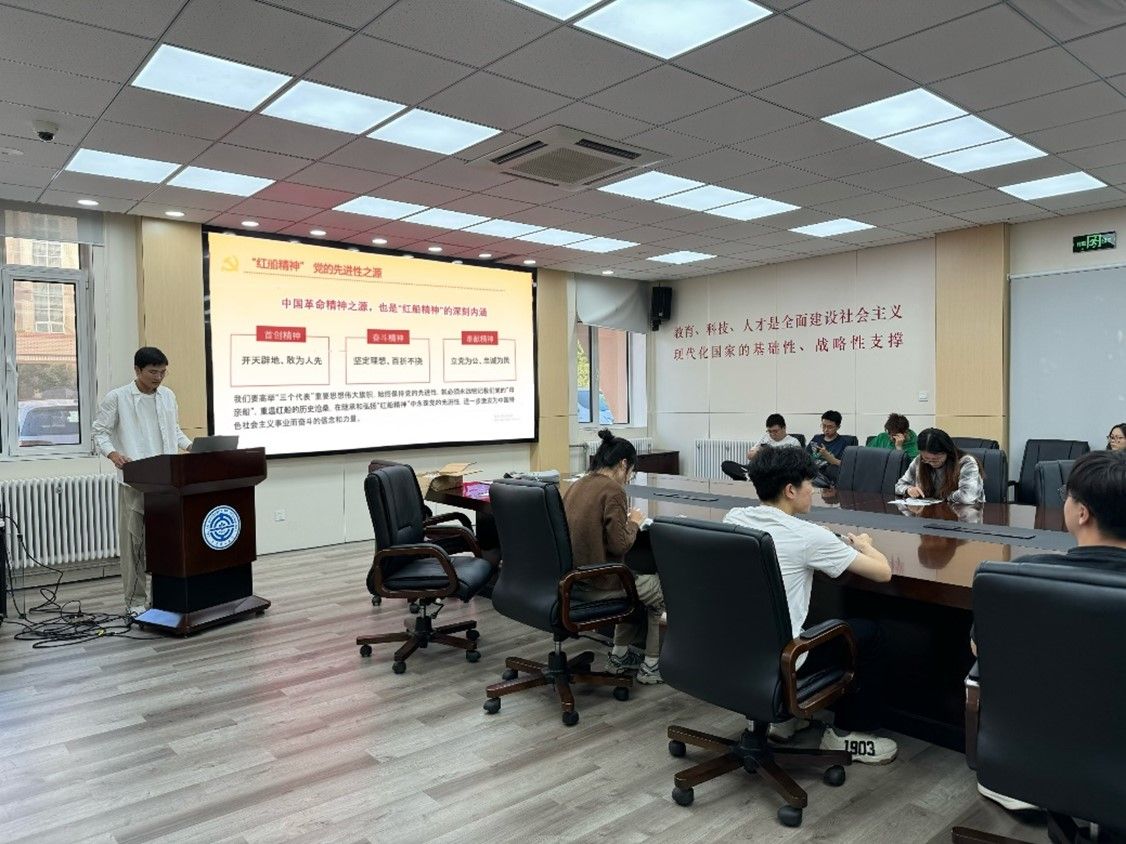 活动伊始,党支部组织委员独士光就“南湖红船”的历史由来、精神传达以及红船精神影响下的著名历史事件与党员们进行了深入交流。1921年7月,中共一大在上海秘密召开,后因法租界巡捕的搜查,代表们紧急将会议地点转移到现代人们广为熟知的浙江嘉兴“南湖红船”上,此次会议标志着中国共产党正式成立。红船见证了中国共产党从无到有、从小到大的伟大历程,其内核蕴涵的开天辟地、敢为人先的首创精神,坚定理想、百折不挠的奋斗精神以及立党为公、忠诚为民的奉献精神,是我们党宝贵的精神财富,是激励中国共产党人和广大人民群众不断前进的强大动力。随后独士光还结合秋收起义、万里长征和抗日战争等具体历史事件,进一步阐述了红船精神在中国革命历程中的重要意义。