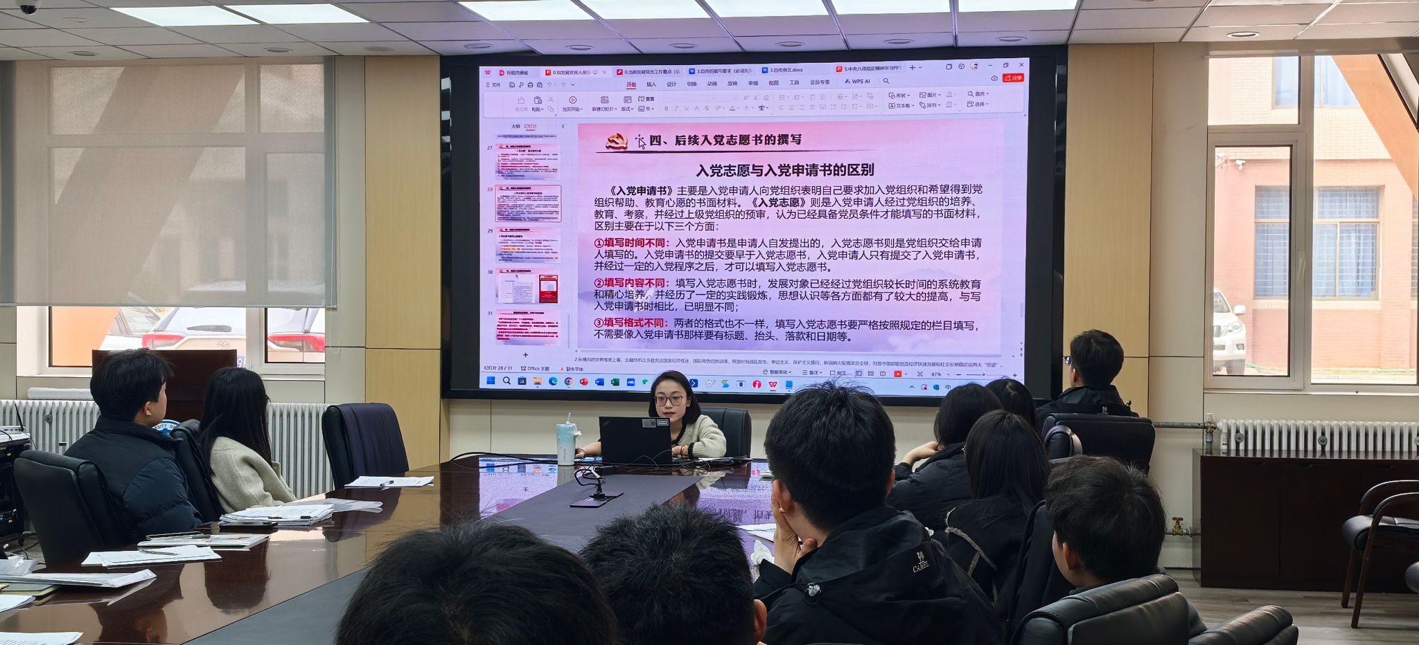 活动开始,王老师重点讲解了入党积极分子在填写个人相关材料时应注意的事项,并指出入党积极分子填写的个人材料对于审查其思想和政治素质具有重要作用,准确、清晰的资料填写是顺利发展为党员的必要步骤。随后,针对当前发展党员工作中常见的问题进行了详细讲解,帮助大家更好地理解和掌握党员发展的基本要求。