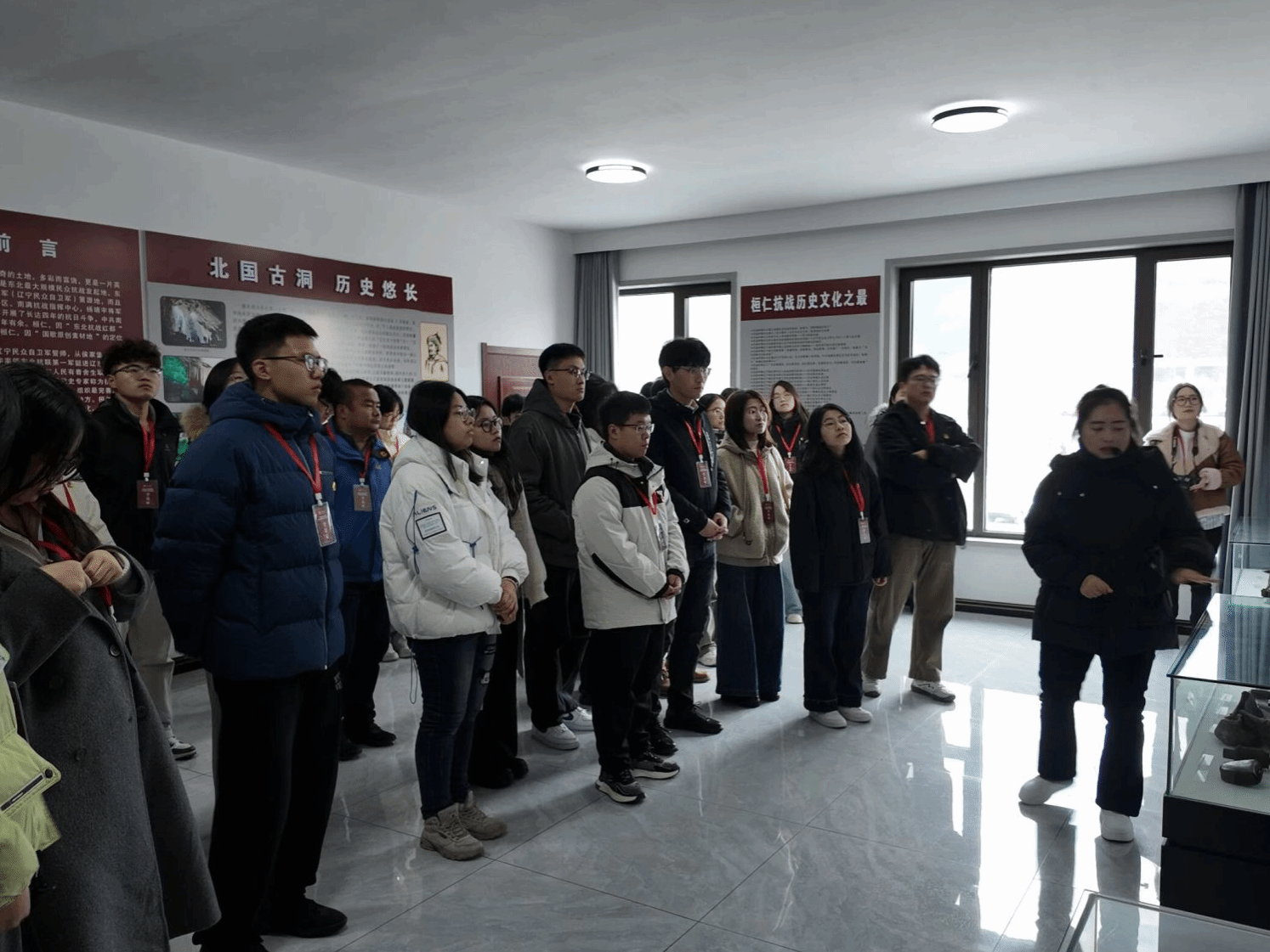 11月1日,团队前往桓仁满族自治县,探访望天洞抗联遗址与东北抗日义勇军纪念馆。在东北抗日义勇军纪念馆,喻执宸和罗番同志共同为英烈敬献花篮,姜心平同志整理缎带,并带领大家现场重温入党誓词。实践团队跟随讲解聆听抗联将士的英勇事迹,在国歌厅唱响《义勇军进行曲》,随后在英烈纪念名单前默哀。