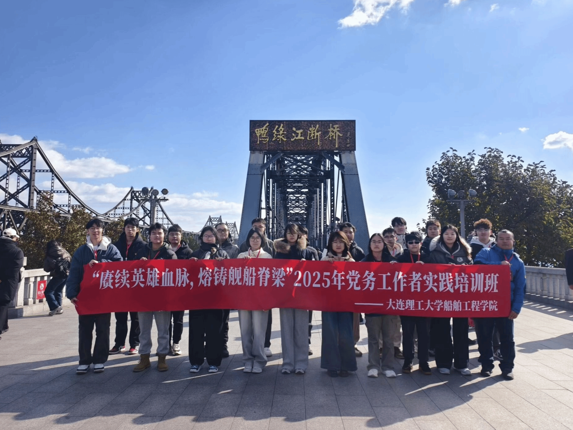 2025年是中国人民抗日战争暨世界反法西斯战争胜利80周年和中国人民志愿军抗美援朝出国作战75周年。为进一步强化党支部书记与优秀学生党员干部的党性修养,助力党员骨干在回望历史中凝聚力量,为新时代船舶事业发展书写崭新篇章,船舶工程学院于10月31日至11月2日组织师生党务工作者赴辽宁本溪、丹东开展“赓续英雄血脉,熔铸舰船脊梁”党务工作者实践培训,通过实地探访、现场教学与专题研讨等环节,引导学员在历史与现实的交融中汲取奋进力量。